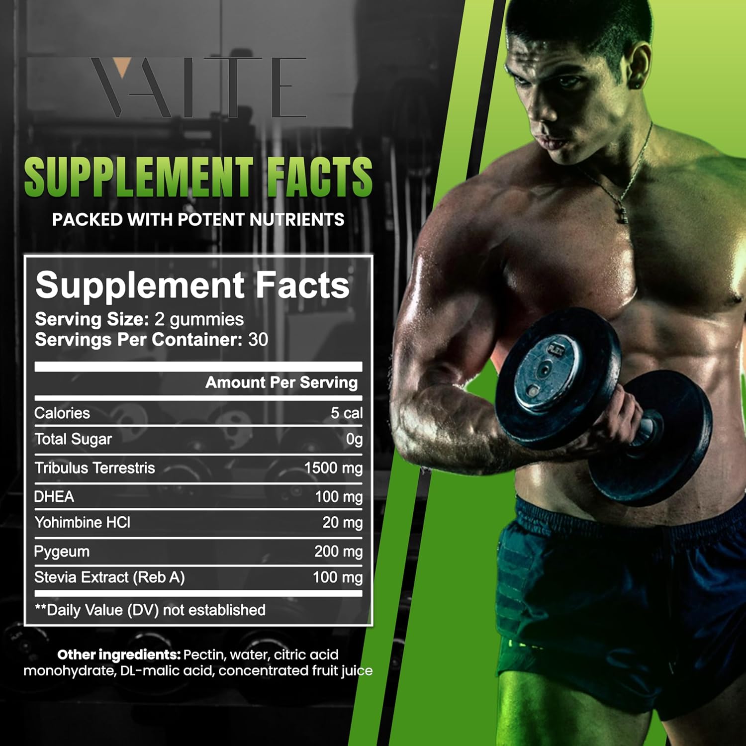 - Tribulus Terrestris 1500mg – Botanical extract highlighted in the composition. Clearly shown per serving, it appears as part of the gummies to reflect traditional plant use in a modern formula